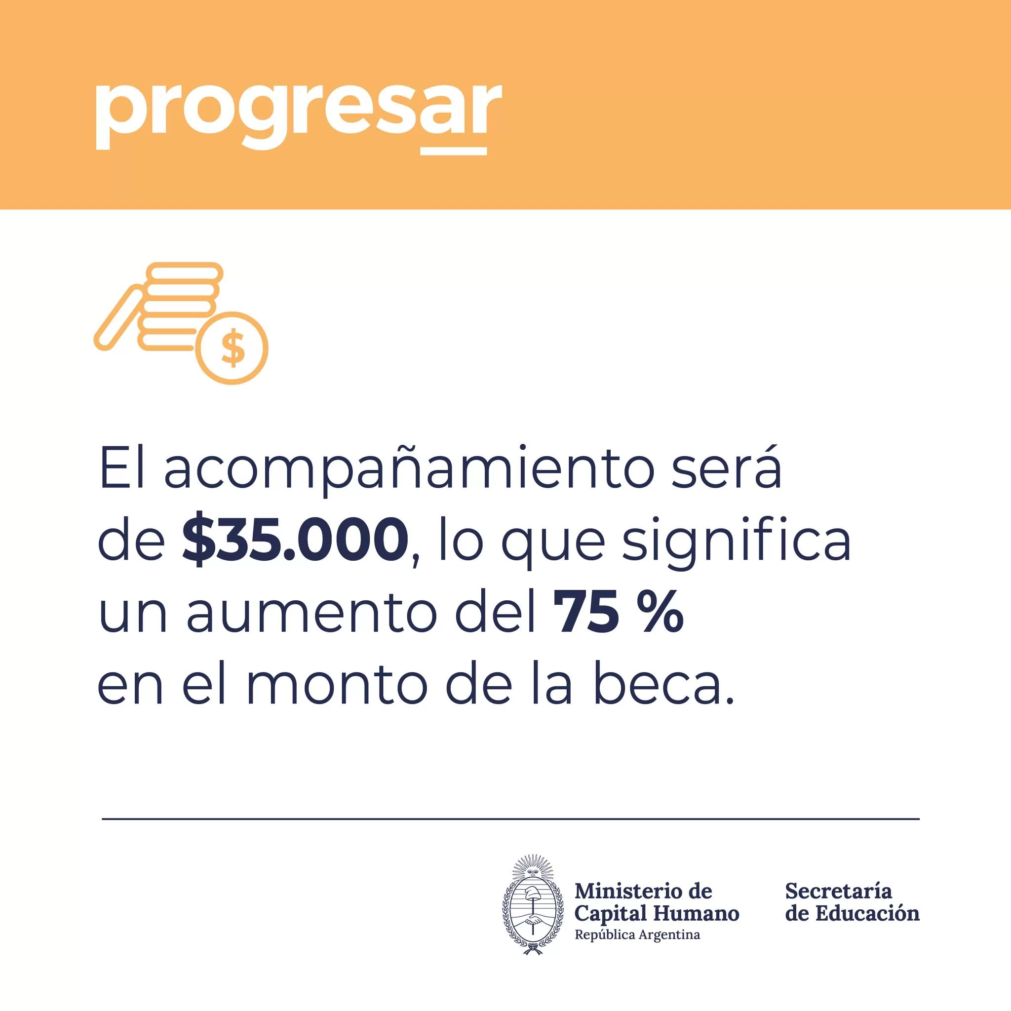 El Ministerio de Capital Humano, a través de la Secretaría de Educación, informó que el valor de la beca Progresar aumentará un 75%. Esto significa que el monto pasará de 20 mil a 35 mil pesos.