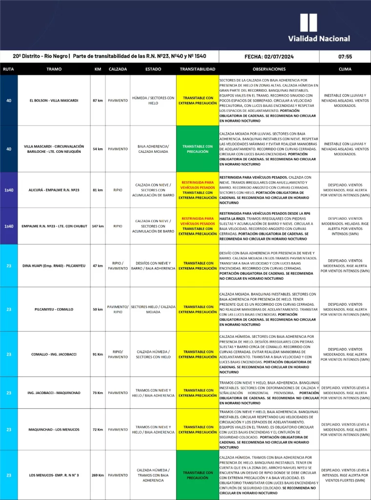 La Región Sur y la cordillera son escenario de nevadas que se acumulan y complican la circulación en rutas y caminos. Para quienes tengan que circular en esa región, la recomendación es informarse respecto al estado de rutas y portar siempre cadenas.