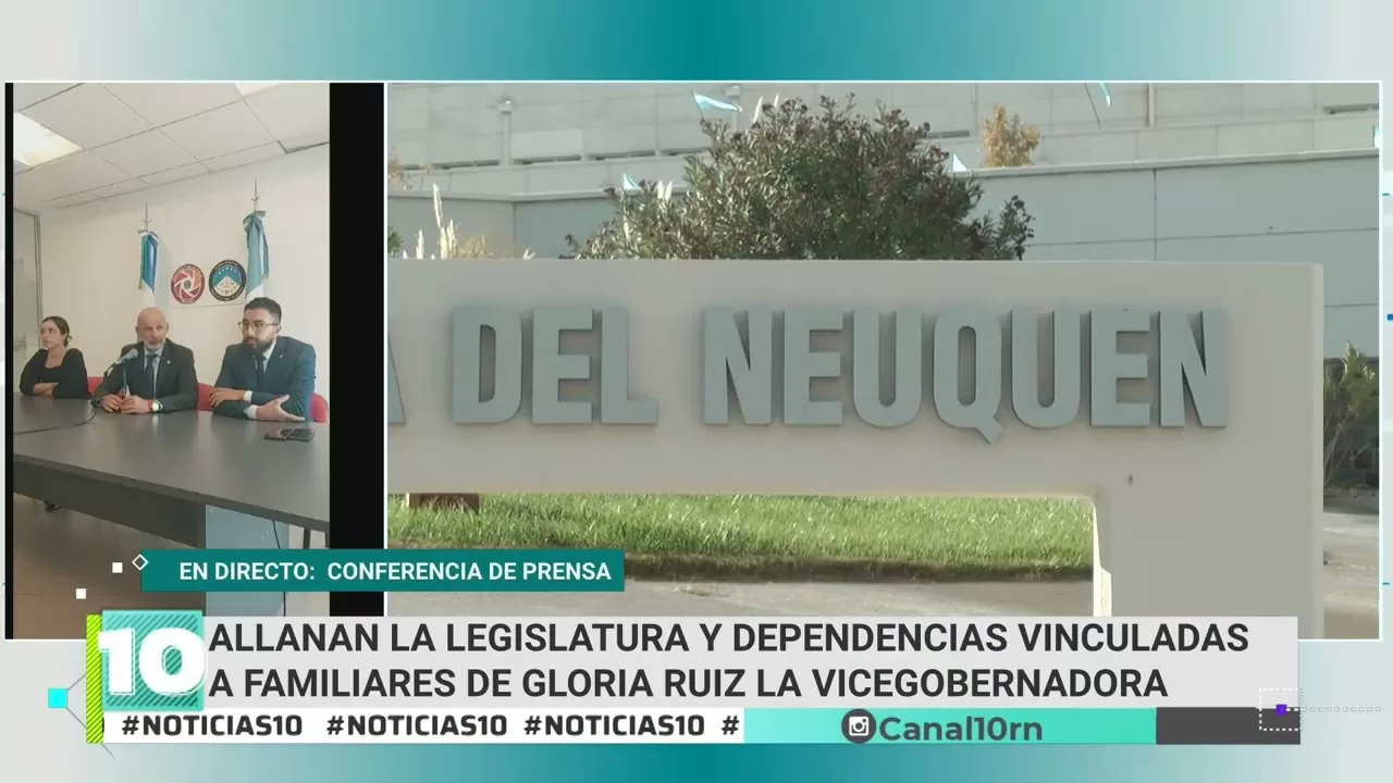 #Noticias10 Allanamientos en la Legislatura de Neuquén Allanan la Legislatura y dependencias vinculadas a familiares de Gloria Ruiz, la Vicegobernadora. Por Camila Bravo 22/11/2024 Actualizada: 22/11/2024 FacebookTwitterWhatsAppTelegram Temas#Diario10#Noticias10Canal 10NeuquénRegionales Seguí viendo Destacadas Sueldos policiales: la Provincia respondió inquietudes y aclaró la situación previsional Redacción - 18/03/2026 00:06:28 Actualidad Duelo en la Policía de Río Negro por la muerte de un oficial en Ruta 22 Camila Guzmán - 16/03/2026 Destacadas Río Negro realizó un nuevo pago del Plan Castello y redujo su deuda en un 55% Redacción - 10/03/2026 Destacadas Convocatoria laboral en Roca: seleccionan maître principal con experiencia en salones gastronómicos Redacción - 09/03/2026