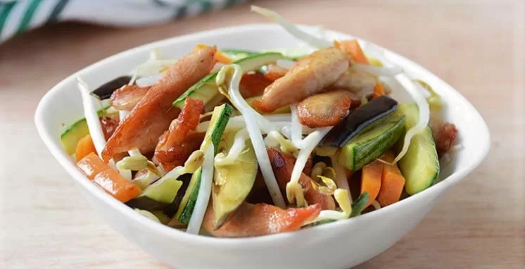 Colocamos un poco de aceite en una sartén o en un wok. Salteamos el pollo, salpimentamos y lo retiramos en cuanto tome color. Reservamos.