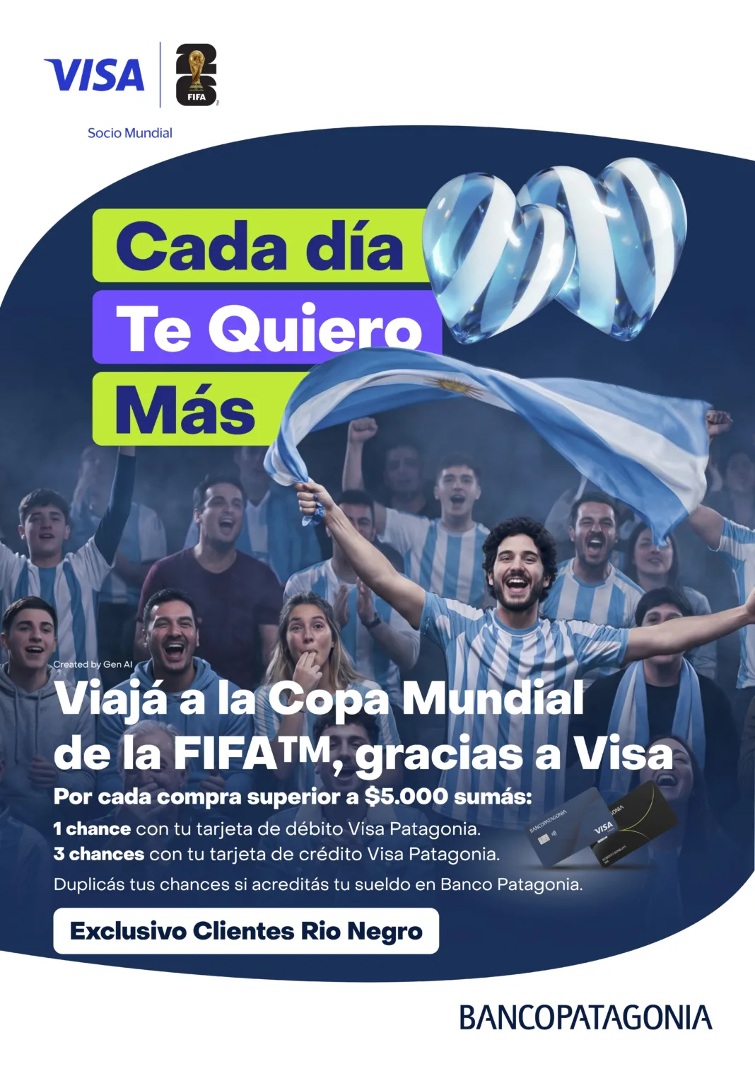 Visa y Banco Patagonia invitan a sus clientes de la provincia de Río Negro a viajar a un evento único e inolvidable. Todos los pagos que se realicen con las tarjetas de crédito y débito Visa Banco Patagonia, entre el 1 y el 30 de abril, suman chances para volar y presenciar una de las semifinales de la Copa Mundial FIFA 2026TM.
