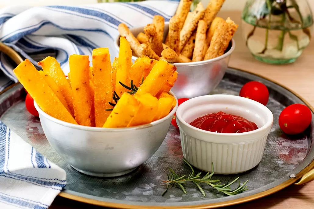 Cuando este enfría cortarla en bastones. Pasar los bastones por huevo batido y pan rallado. En una sartén calentar con un poco de aceite y freír los bastoncitos de polenta hasta que estén crujientes, por todos los lados.