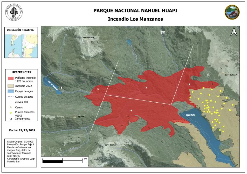 Según el último reporte emitido por Parque Nacional Nahuel Huapi este domingo 29 de diciembre, el incendio se mantiene activo. Para planificar las acciones operativas y analizar técnicamente el comportamiento del fuego, el área afectada se ha sectorizado de la siguiente manera: