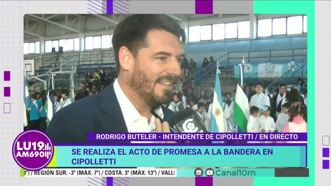 Se realiza en la ciudad de Cipolletti la promesa a la bandera por parte de estudiantes de 4º grado. El acto se realiza en el Estadio Municipal y es organizado por el Municipio de esa localidad Alto Valle. El intendente Rodrigo Buteler dialogó con el móvil en vivo de #Noticias10 para #LU19.