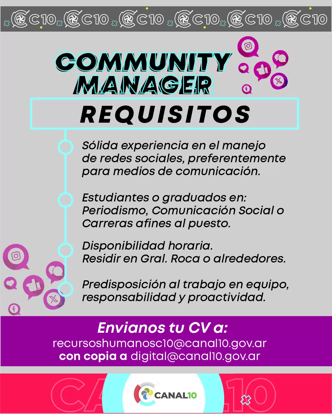 Envianos tu CV a recursoshumanosc10@canal10.gov.ar con copia a digital@canal10.gov.ar Tenés tiempo hasta el miércoles 18 de diciembre.