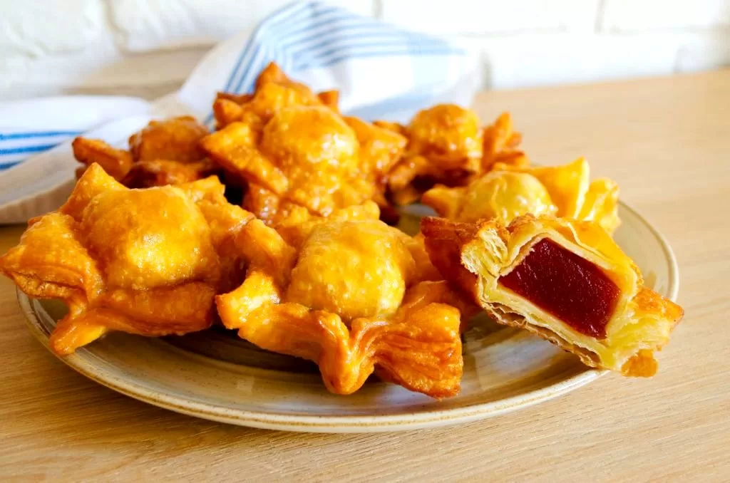 Finalmente estirar la masa de 5 mm de espesor y cortar cuadrados iguales. Colocar en el centro un cubo de dulce de membrillo y tapar con otro cuadrado de masa, en forma contraria. Dar los pellizcos característicos de los pastelitos y freírlos en abundante aceite caliente, hasta dorarlos.