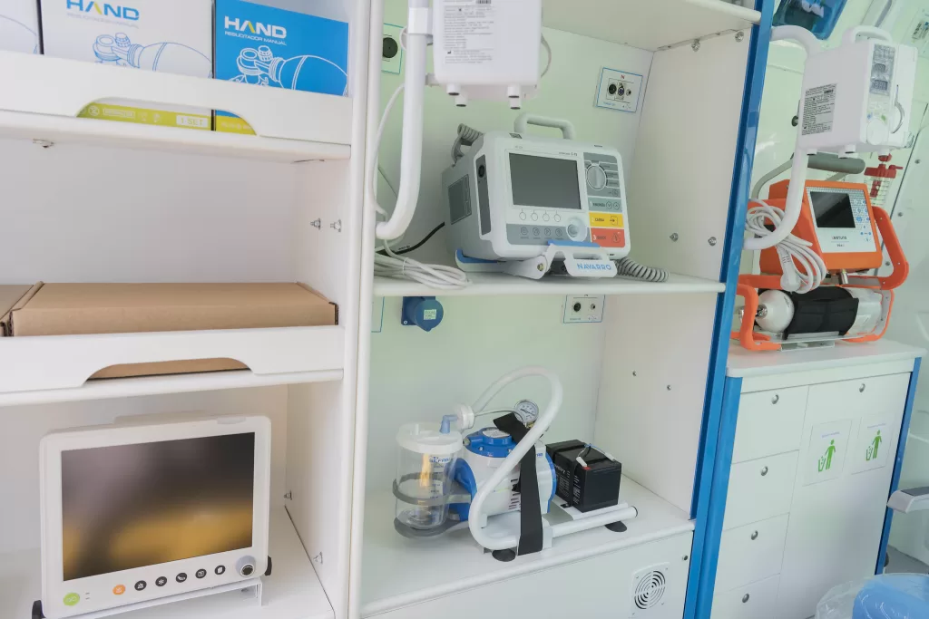 - Soporte avanzado: bomba de infusión para administración controlada de medicamentos, instrumental para manejo de vía aérea y trauma, camilla de traslado móvil y tabla de inmovilización.