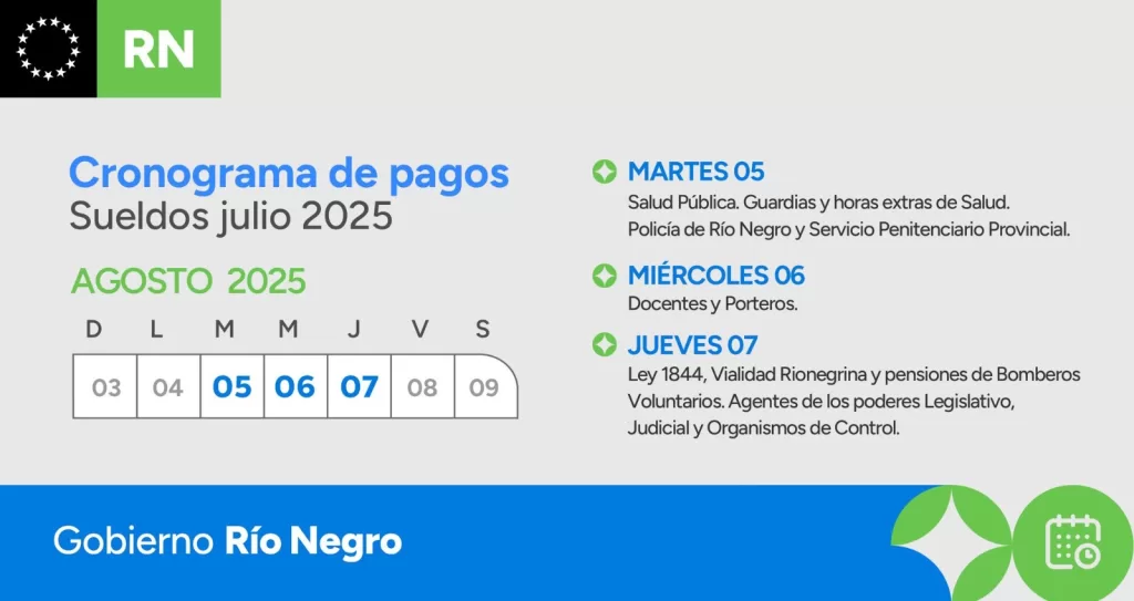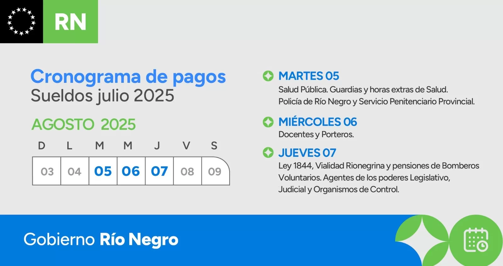 Así lo anunció el Gobierno de Río Negro. El próximo martes 5 de agosto comenzará el pago de sueldos al personal de la Administración Pública provincial.