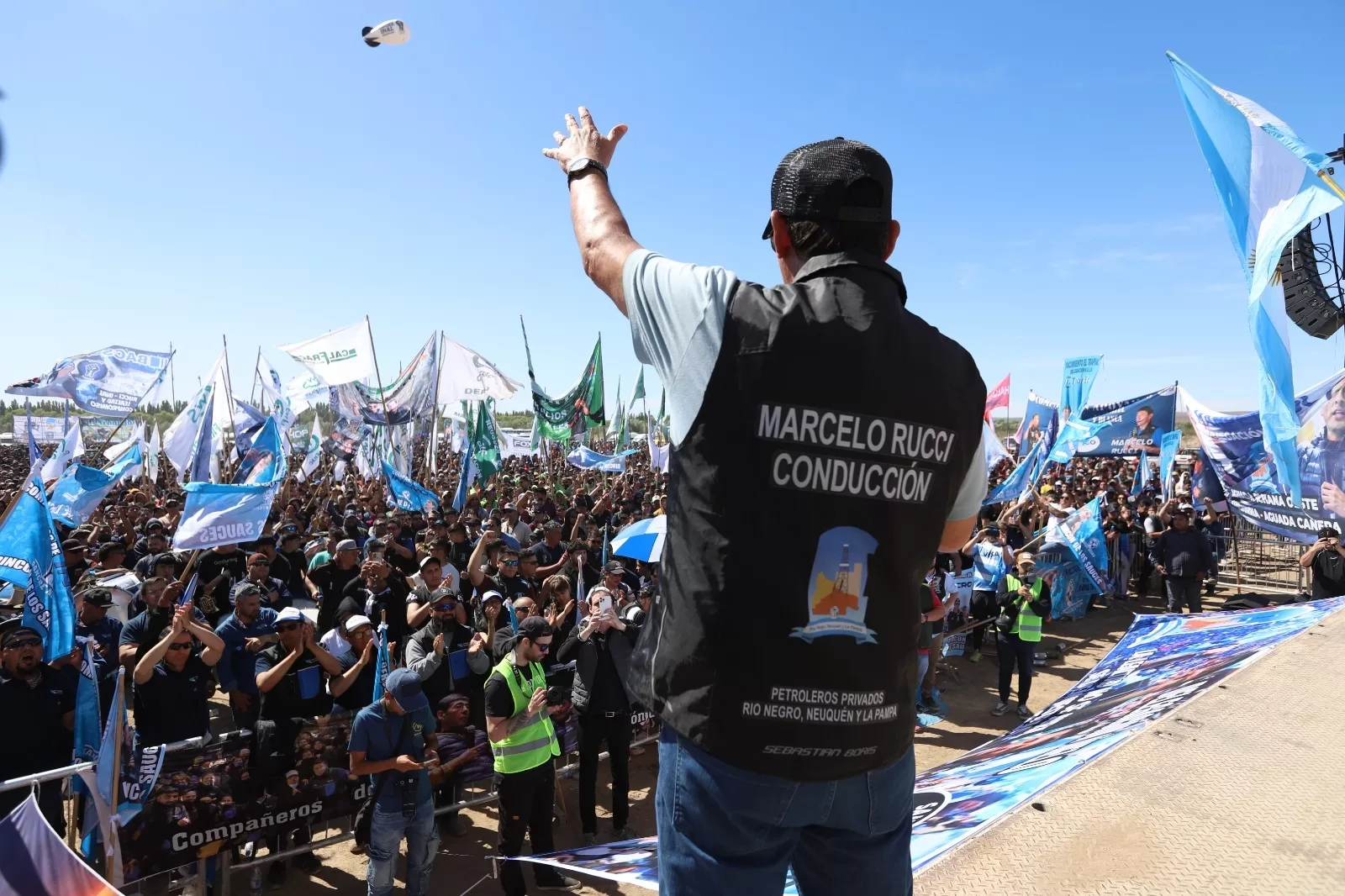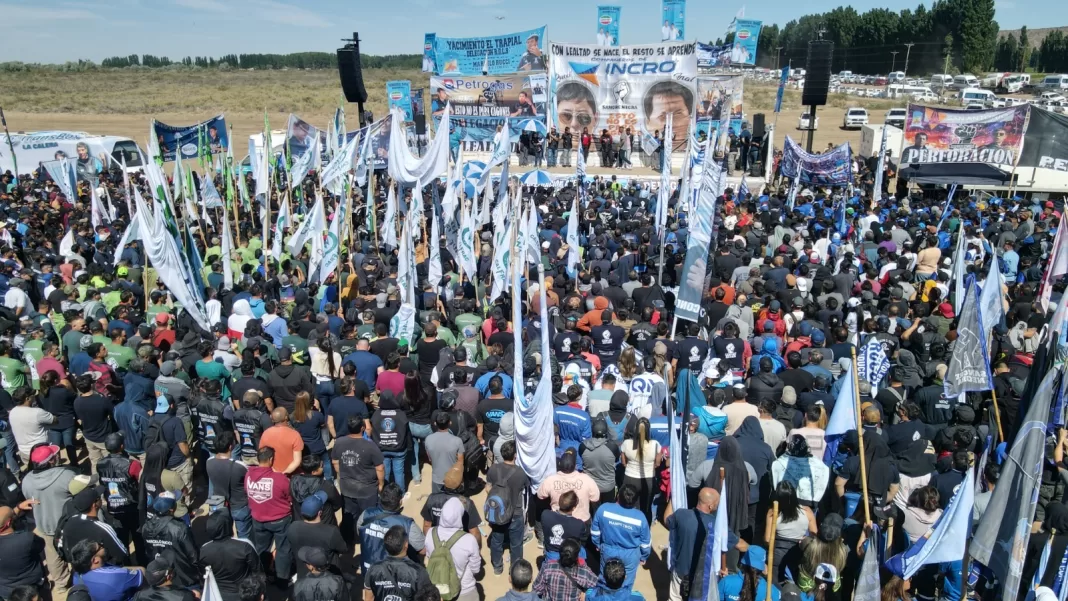El Secretario General del Sindicato de Petroleros Privados, Marcelo Rucci, encabezó este martes una multitudinaria Asamblea General en Añelo para explicar los alcances del último acuerdo paritario. “Estar acá arriba es un espectáculo increíble; es un honor saber que ustedes han confiado en nosotros para llevar adelante una negociación tan difícil y compleja”, expresó.